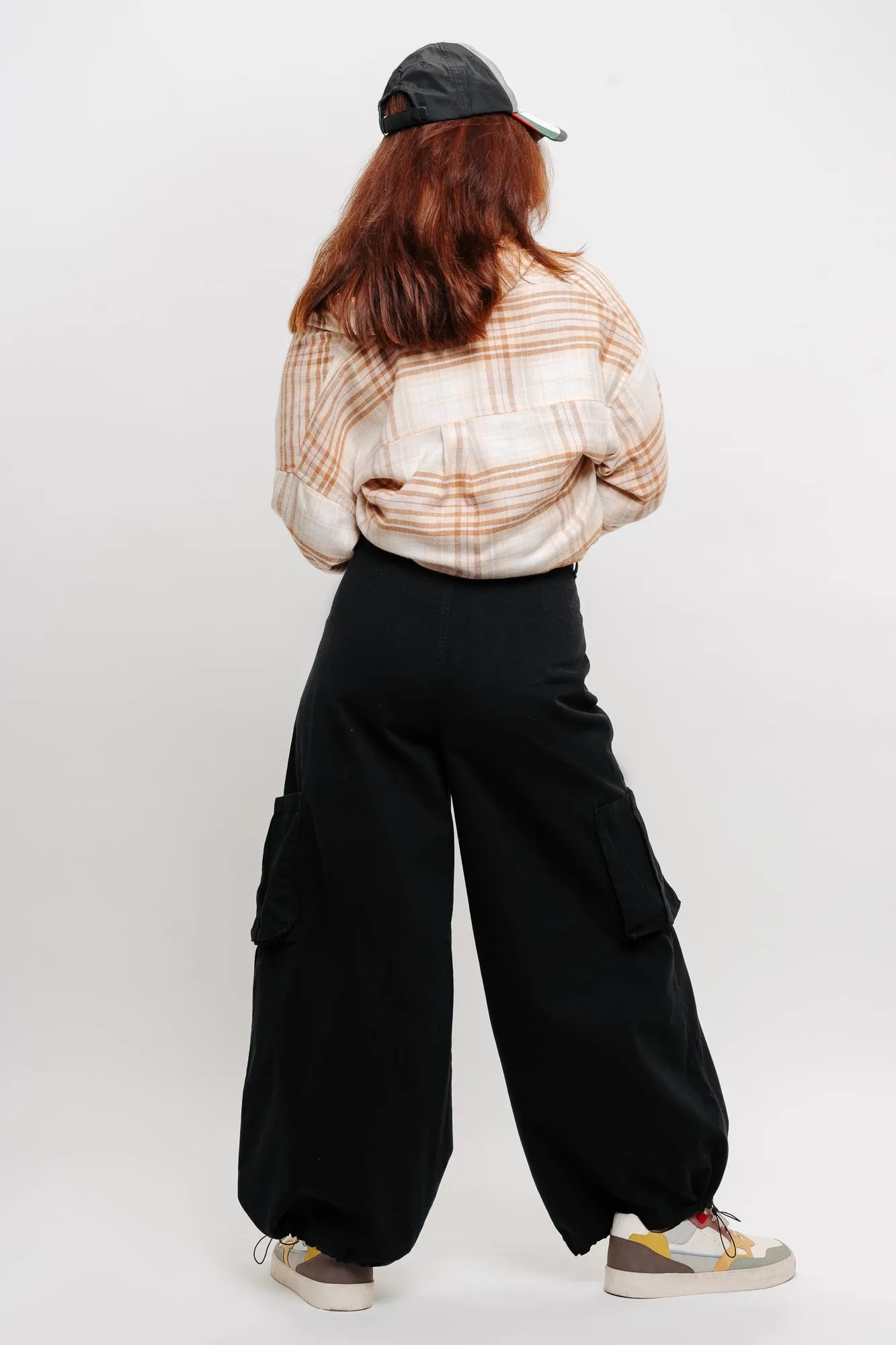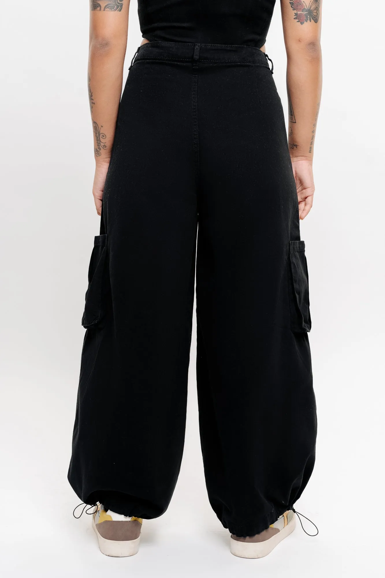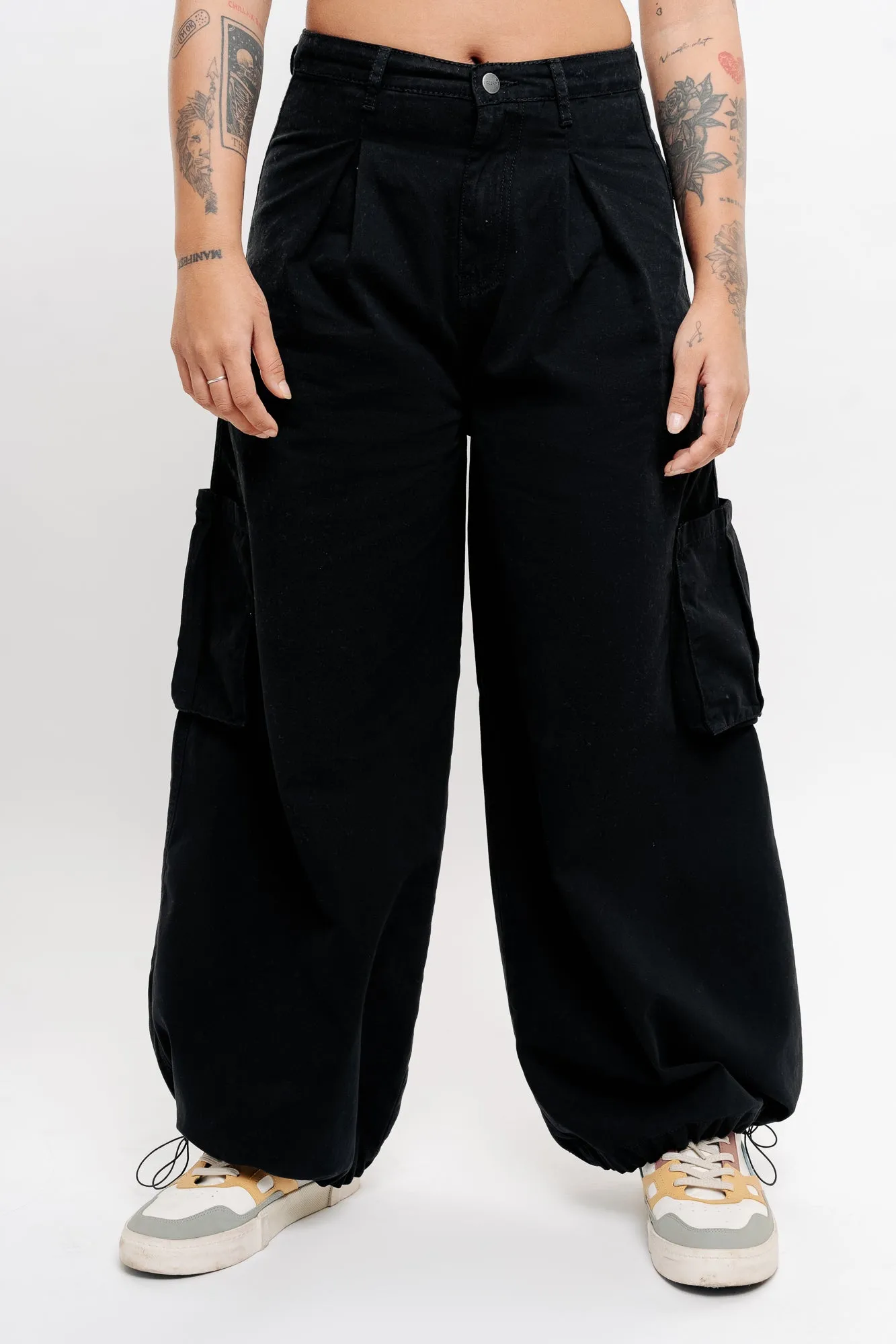 Description: These Black Pleated Wide Balloon Pants redefine casual style with their sleek black design and contrasting white lines in a trendy wide fit. Pair them with a graphic tee and chunky sneakers for a sporty urban look that's effortlessly cool.